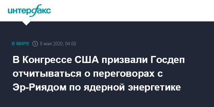 Москва. 5 мая. INTERFAX.RU - Американское Управление правительственной отчетности (беспартийный наблюдательный совет Конгресса) распространило доклад, в котором предлагается, чтобы госдепартамент и министерство энергетики США регулярно информировали Конгресс о ведущихся с Саудовской Аравией переговорах по ядерному сотрудничеству.
