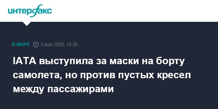 "Имеющиеся данные свидетельствуют о том, что риск передачи инфекции на борту воздушного судна невелик. Ношение масок пассажирами и экипажем снизит и без того низкий риск, не провоцируя при этом резкого увеличения стоимости авиаперелетов, которое принесут меры социальной дистанции", - говорится в сообщении.