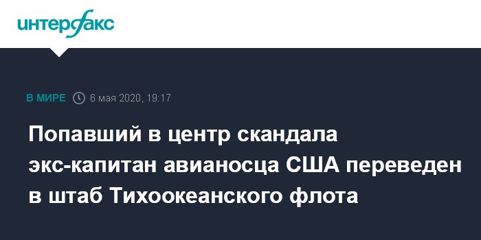 Москва. 6 мая. INTERFAX.RU - Бывший капитан американского атомного авианосца USS Theodore Roosevelt ("Теодор Рузвельт") Бретт Крозье, снятый с должности после того, как его рапорт о вспышке коронавируса на борту корабля попал в СМИ, переведен на должность помощника начальника штаба военно-морской авиации Тихоокеанского флота США, сообщили в Пентагоне.