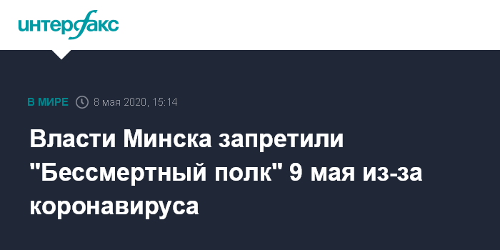 Москва. 8 мая. INTERFAX.RU - Минский горисполком запретил трем общественным организациям проводить 9 мая шествие "Бессмертный полк" и сослался на необходимость профилактики острых респираторных инфекций, в том числе COVID-19. Ответ чиновников организаторам опубликовало издание TUT.BY.