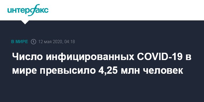 Москва. 12 мая. INTERFAX.RU - В мире по состоянию на 04:00 по Москве насчитывается 4 250 574 человека, заразившихся коронавирусом с начала распространения инфекции, сообщил сайт Worldometer, который специализируется на мировой статистике.