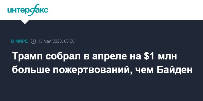 Между тем, по данным предвыборного штаба бывшего вице-президента США Джо Байдена, ему и Национальному комитету Демократической партии удалось собрать за апрель $60,5 млн пожертвований.