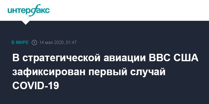 Москва. 14 мая. INTERFAX.RU - Среди служащих авиабазы Эллсворт (штат Южная Дакота), где размещается авиакрыло американских стратегических бомбардировщиков B-1B Lancer, зафиксирован первый случай заражения коронавирусом, сообщило в среду командование базы.