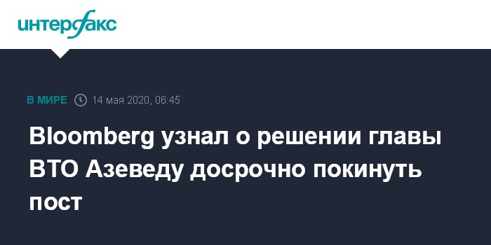 Москва. 14 мая. INTERFAX.RU - Генеральный директор Всемирной торговой организации (ВТО) Роберту Азеведу проинформировал правительства стран-членов организации о своем намерении уйти в отставку до истечения срока полномочий в 2021 году, сообщает Bloomberg со ссылкой на четыре осведомленных источника.