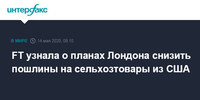 Москва. 14 мая. INTERFAX.RU - В британском правительстве обсуждают возможность снизить тарифы на импорт американской сельскохозяйственной продукции ради прогресса на двухсторонних переговорах о свободной торговле, пишет Financial Times со ссылкой на источники в кабмине.