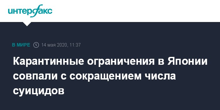 Москва. 14 мая. INTERFAX.RU - В апреле в Японии количество самоубийств снизилось на 20% в годовом измерении, c 1814 до 1455. Это самый значительный спад за последние пять лет, пишет Guardian. 7 апреля правительство страны объявило о введении ЧП и ряда сопутствующих ограничений по коронавирусу с 16 апреля.