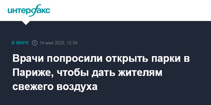 Москва. 14 мая. INTERFAX.RU - Профсоюз французских врачей CSMF призвал власти страны разрешить мэрии Парижа открыть городские парки, чтобы дать возможность жителям поправить здоровье после примерно двух месяцев самоизоляции.