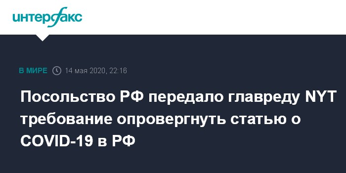 Москва. 14 мая. INTERFAX.RU - Посольство России в США передало главному редактору The New York Times письмо с требованием опровергнуть информацию о статистике коронавируса в России.
