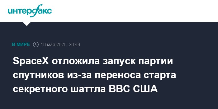 Москва. 16 мая. INTERFAX.RU - Запуск на орбиту очередной партии из 60 спутников для продолжения развертывания глобальной сети интернет-покрытия системы Starlink перенесен на 18 мая, сообщила компания SpaceX.