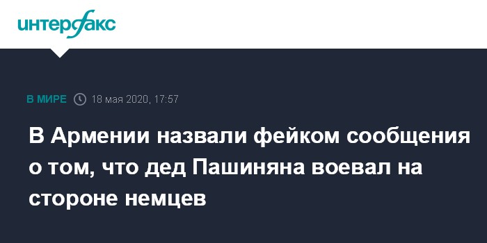Москва. 18 мая. INTERFAX.RU - В Ереване опровергли появившуюся в российских СМИ информацию о том, что дед премьер-министра Армении Никола Пашиняна якобы воевал против Красной армии во время Великой Отечественной войны.