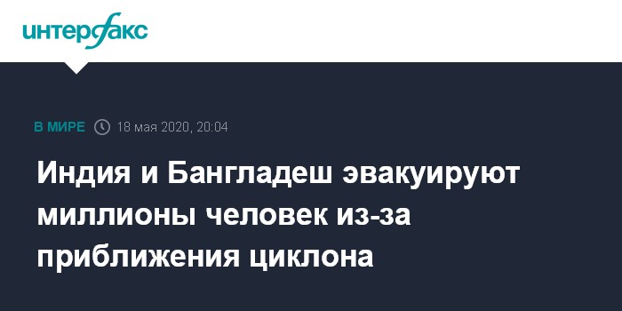 Москва. 18 мая. INTERFAX.RU - Индия и Бангладеш приступили к эвакуации более 2 млн человек, чьи дома находятся в потенциально опасных из-за приближения мощного циклона районах, сообщают в понедельник индийские СМИ.