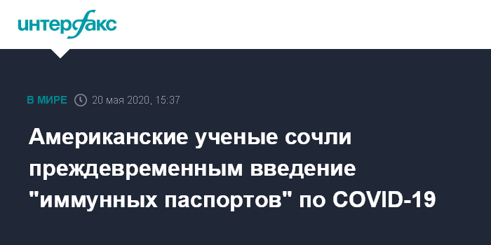 Москва. 20 мая. INTERFAX.RU - Введение "иммунных паспортов" для невосприимчивых к вирусу SARS-CoV-2 на данном этапе преждевременно, считают американские исследователи.