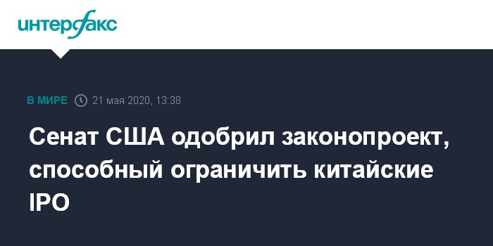 Москва. 21 мая. INTERFAX.RU - Сенат США в среду единогласно одобрил законопроект, который может лишить китайские компании возможности размещать свои акции на американских биржах.