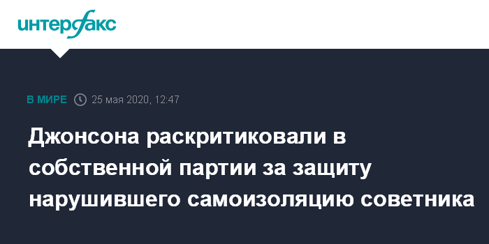 Москва. 25 мая. INTERFAX.RU - В правящей Консервативной партии Великобритании выражают недовольство премьером страны Борисом Джонсоном после того, как он выступил в защиту своего советника Доминика Каммингса из-за его поездки к родителям в разгар пандемии COVID-19, сообщает в понедельник британский телеканал ITV.