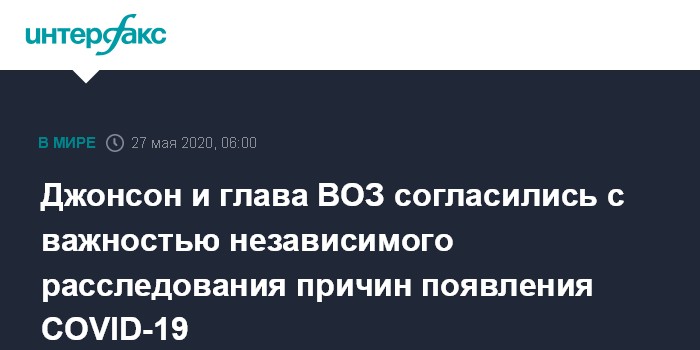 Москва. 27 мая. INTERFAX.RU - Премьер-министр Великобритании Борис Джонсон в ходе переговоров с директором Всемирной организации здравоохранения (ВОЗ) Тедросом Адханом Гебрейесусом подчеркнул важность проведения независимого расследования причин возникновения COVID-19.