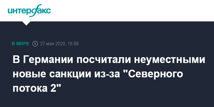 Москва. 27 мая. INTERFAX.RU - Позиция ФРГ относительно газопровода "Северный поток 2" не изменилась, Берлин считает, что новые санкции США были бы не к месту и не ко времени, заявила представитель министерства экономики и энергетики ФРГ Анна Софи Айхлер.