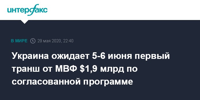 "Мы завершили переговоры с МВФ, президент также провел телефонный разговор с руководителем МВФ, и 5 июня мы ожидаем подписание договора и получение первого транша. Программа на 18 месяцев, кредит на 5 лет, сумма $5 млрд. И это кредит по программе stand-by с достаточно упрощенными условиями, который даст возможность нам двигаться спокойно в преодолении тех последствий коронакризиса, которые уже есть", - сказал глава правительства в эфире программы "Свобода слова Савика Шустера" на телеканале "Украина".