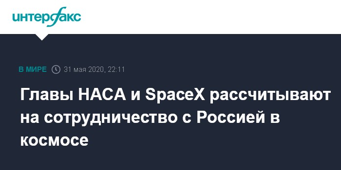 Москва. 31 мая. INTERFAX.RU - Главы НАСА и компании SpaceX Джим Брайденстайн и Илон Маск отреагировали на поздравление главы "Роскосмоса" Дмитрия Рогозина, отметив, что американская сторона рассчитывает на продолжение сотрудничества с Россией в космической отрасли.