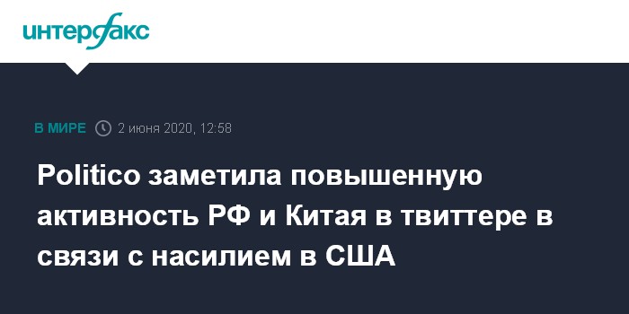 Москва. 2 июня. INTERFAX.RU - Начиная с 30 мая, события в США более 1,2 тысячи раз упоминались в сообщениях твиттер-аккаунтов, связанных с Россией и Китаем, сообщает американское издание Politico со ссылкой на собственное исследование.