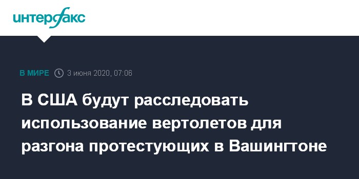 Москва. 3 июня. INTERFAX.RU - Национальная гвардия округа Колумбия проведет расследование по факту использования вертолетов для разгона толпы протестующих в Вашингтоне, сообщает The Hill со ссылкой на пресс-секретаря нацгвардии округа Брук Дэвис.