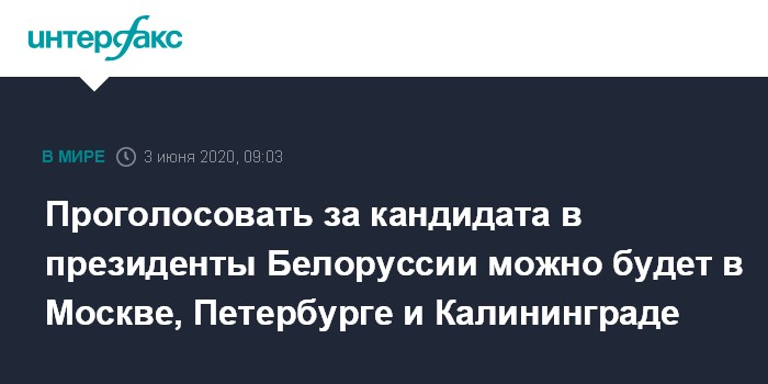 Москва. 3 июня. INTERFAX.RU - В России определены три избирательных участка для голосования на выборах президента Белоруссии в августе 2020 года - в Москве, Калиниграде и Петербурге, сообщило белорусское посольство в Москве.