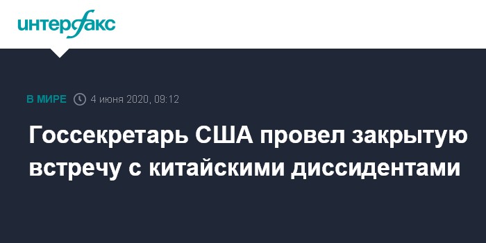 Москва. 4 июня. INTERFAX.RU - В канун 31-й годовщины событий на пекинской площади Тяньаньмэнь 4 июня 1989 года госсекретарь США Майк Помпео встретился с группой китайских диссидентов - участников выступлений, бежавших в Соединенные Штаты, сообщил Госдеп.