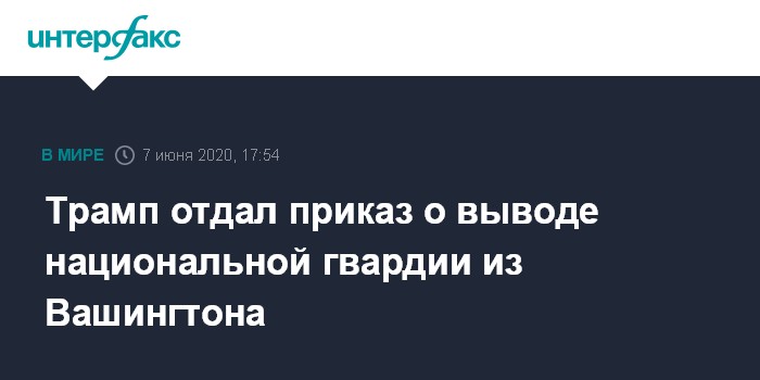 Москва. 7 июня. INTERFAX.RU - Президент США Дональд Трамп сообщил, что распорядился вывести из столицы подразделения национальной гвардии, которые были задействованы для наведения порядка в городе в ходе массовых акций протеста в связи с гибелью по вине полиции афроамериканца Джорджа Флойда.