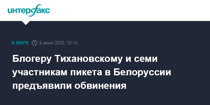 Москва. 9 июня. INTERFAX.RU - Следственный комитет Белоруссии подтвердил предъявление обвинения Сергею Тихановскому, белорусскому блогеру и руководителю инициативной группы претендующей на пост президента страны Светланы Тихановской.