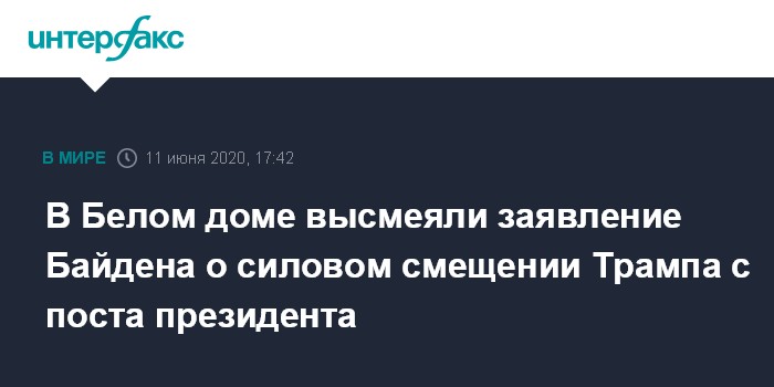 Москва. 11 июня. INTERFAX.RU - Пресс-секретарь Белого дома Кейли Макэнани в четверг назвала нелепым предположение бывшего вице-президента США Джо Байдена о том, что президент США Дональд Трамп попытается украсть победу на президентских выборах и понадобится сила для снятия его с должности.