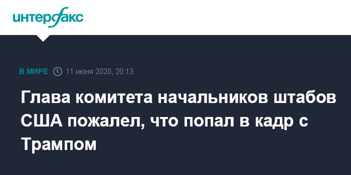 Москва. 11 июня. INTERFAX.RU - Глава Объединённого комитета начальников штабов (ОКНШ) США Марк Милли сожалеет о том, что на прошлой неделе попал в кадр с президентом Дональдом Трампом по дороге в церковь Святого Иоанна в Вашингтоне, пишет в четверг издание The Hill.