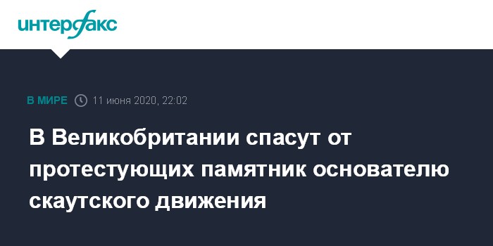 Москва. 11 июня. INTERFAX.RU - Власти города Пул в британском графстве Дорсет планируют демонтировать памятник основателю скаутского движения Роберту Баден-Пауэллу, чтобы спасти его от демонстрантов, которые могут нанести ему ущерб, сообщает в пятницу британский телеканал Sky News.
