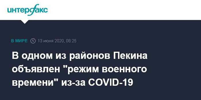 Москва. 13 июня. INTERFAX.RU - "Режим военного времени" объявлен в 11 микрорайонах района Фэнтай китайской столицы после того, как у пяти работников расположенного там оптового рынка "Синьфади" была диагностирована коронавирусная инфекция, сообщил исполняющий обязанности главы района Чу Цзюньвэй.