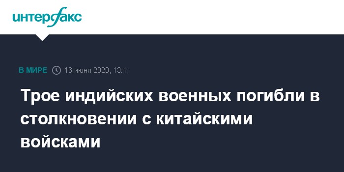 Москва. 16 июня. INTERFAX.RU - Трое индийских военнослужащих погибли в ночь на вторник в ходе столкновения с китайскими военными в восточной части индийской области Ладакх в гималайском регионе на границе с Китаем, сообщила 16 июня армия Индии.