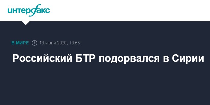 Москва. 16 июня. INTERFAX.RU - Российский бронетранспортер получил незначительные повреждения в результате подрыва боевиками в Сирии взрывного устройства, сообщил во вторник официальный представитель Минобороны РФ Игорь Конашенков.