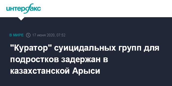 Москва. 17 июня. INTERFAX.RU - В городе Арысь Туркестанской области Казахстана задержан организатор телеграм-каналов суицидальной направленности для подростков, сообщил портал МВД республики.
