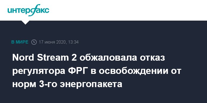 15 мая Федеральное сетевое агентство Германии отказало компании Nord Stream 2 в предоставлении дерогации (частичной отмене старого закона) по заявке от 10 января 2020 г. Власти считают, что на 23 мая 2019 г. газопровод "Северный поток 2" не соответствовал критерию "завершенности проекта", как того требует параграф 28b пункта 1 федерального закона об энергетическом хозяйстве ФРГ.