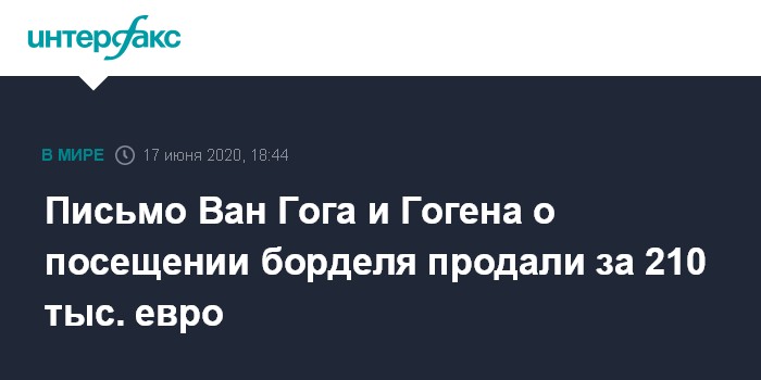 Москва. 17 июня. INTERFAX.RU - Письмо художников Винсента Ван Гога и Поля Гогена их французскому коллеге Эмилю Бернару о подробностях посещения борделя ушло с молотка за 210 тысяч евро, пишет "Би-би-си".