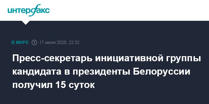 Москва. 17 июня. INTERFAX.RU - Пресс-секретаря инициативной группы претендента на пост президента Белоруссии Светланы Тихановской Александра Кабанова посадили на 15 суток, сообщил в среду правозащитный центр "Весна".