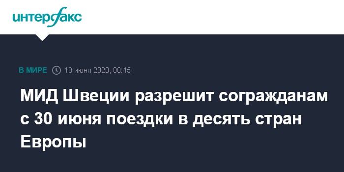 Москва. 18 июня. INTERFAX.RU - МИД Швеции объявил, что с 30 июня отменит рекомендацию согражданам не ездить в десять стран Европы - Бельгию, Хорватию, Францию, Грецию, Исландию, Италию, Люксембург, Португалию, Швейцарию и Испанию. Об этом пишет The Local.