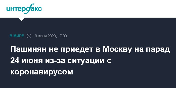 Москва. 19 июня. INTERFAX.RU - Премьер-министр Армении Никол Пашинян сообщил, что не поедет на парад Победы в Москву 24 июня.