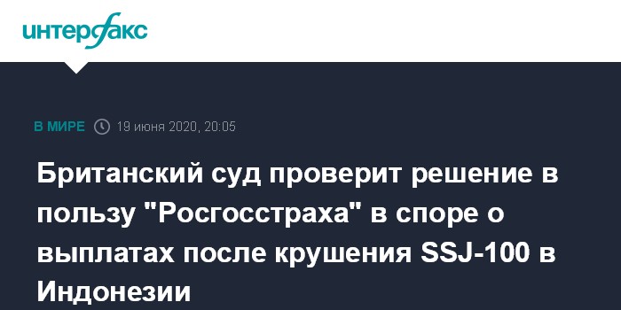 Москва. 19 июня. INTERFAX.RU - Высокий суд Англии и Уэльса отклонил ходатайство "Росгосстраха" об упрощенном признании и приведении в исполнение решения Арбитражного суда Ханты-Мансийского округа (ХМАО), который взыскал со Swiss Re и группы других иностранных перестраховщиков более $20 млн после крушения самолета Sukhoi SuperJet 100 (SSJ-100) в рамках демонстрационного тура в Индонезии в 2012 году.