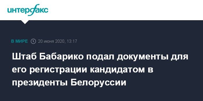 Москва. 20 июня. INTERFAX.RU - Штаб экс-главы Белгазпромбанка Виктора Бабарико подал документы в Центральную избирательную комиссию Белоруссии для его регистрации в качестве кандидата в президенты.