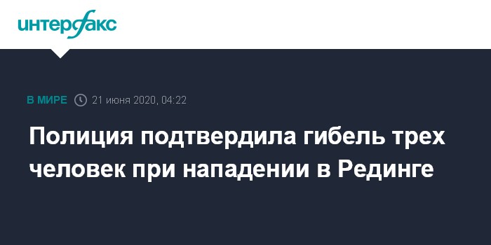 Москва. 21 июня. INTERFAX.RU - Территориальное отделение полиции Темс-Валли подтвердило сообщения СМИ о гибели по меньшей мере трех человек в результате нападения с ножом в субботу вечером в парке британского города Рединга.