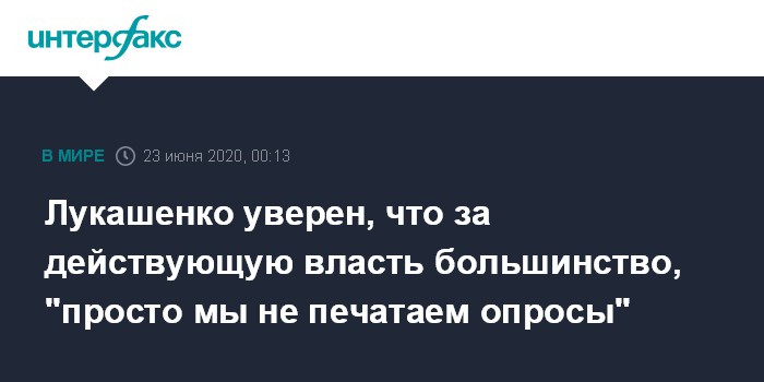 "Власть сегодня в Беларуси не поменяют! Не потому, что мы ее будем посиневшими пальцами удерживать, а потому что большинство подавляющее - и мы знаем, какое это большинство - (за меня - ИФ). Мы просто не печатаем эти социологические опросы...", - заявил он во время встречи с оппозиционерами в Бресте 22 июня. Сюжет о беседе президента с местной оппозицией был показан в эфире телеканала "Беларусь-1".