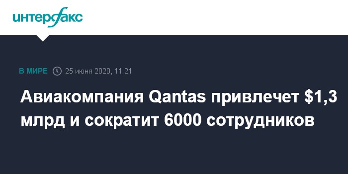 Москва. 25 июня. INTERFAX.RU - Крупнейшая авиакомпания Австралии Qantas Airways привлечет финансирование в размере до 1,9 млрд австралийских долларов ($1,3 млрд) и сократит как минимум 6000 сотрудников из-за пандемии. Сокращение затронет пятую часть штата перевозчика по состоянию перед началом пандемии, отмечает BBC.
