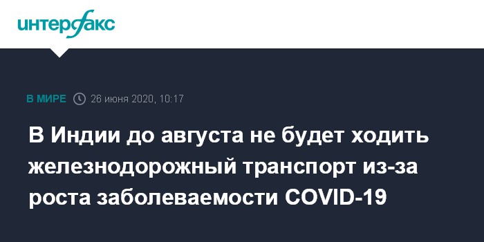 Москва. 26 июня. INTERFAX.RU - Индийская компания Indian Railways, управляющая 99% железнодорожной сети в стране, решила приостановить все пассажирские перевозки из-за роста числа новых случаев заболевания коронавирусом, сообщает в пятницу издание The Times of India.
