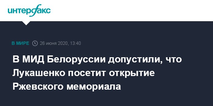 Как сообщалось со ссылкой на пресс-секретаря президента РФ Дмитрия Пескова, прорабатывается возможность участия президента Белоруссии в церемонии открытия мемориала Советскому солдату под Ржевом. На вопрос журналистов, поступило ли приглашение Лукашенко посетить мемориал под Ржевом, Песков сказал: "Да, такая возможность прорабатывается".