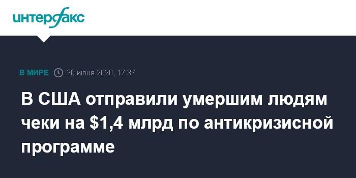 Москва. 26 июня. INTERFAX.RU - Федеральная налоговая служба США отправила порядка 1,1 млн чеков на общую сумму около $1,4 млрд уже умершим людям в рамках программы помощи населению в условиях кризиса, вызванного пандемией коронавируса, свидетельствуют данные Счетной палаты США.