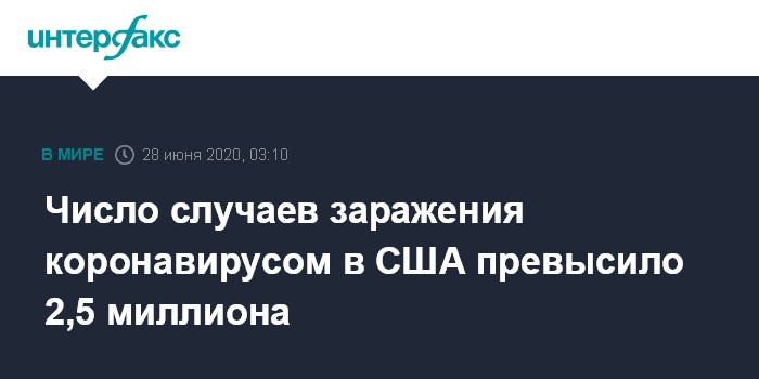 Москва. 28 июня. INTERFAX.RU - В Соединенных Штатах зафиксировано 2 500 419 случаев заражения коронавирусом COVID-19, скончались 125 434 человек, свидетельствуют данные американского университета Джонса Хопкинса.