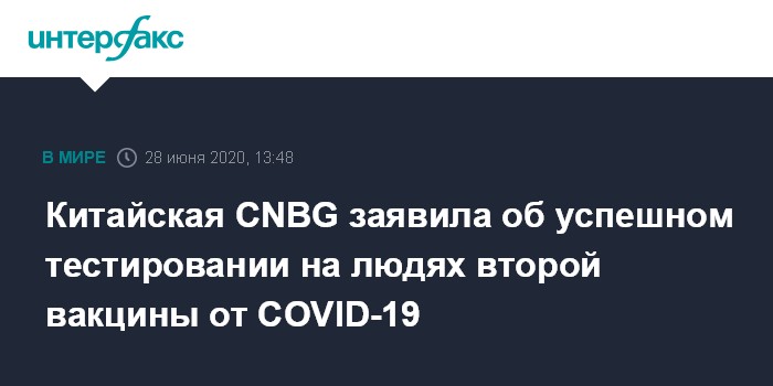 Москва. 28 июня. INTERFAX.RU - Китайская компания China National Biotec Group (CNBG), разрабатывающая сразу две возможных вакцины от коронавируса, заявила об оптимистических результатах тестирования одной из них на людях, сообщают в воскресенье региональные СМИ.